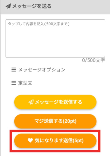 メッセージも同じ5P消費(50円)を消費するので、気になります送信をするのであれば、内容をしっかり考えてメッセージした方が返信率は高いので、こちらの機能の使用はあまりおすすめできません。