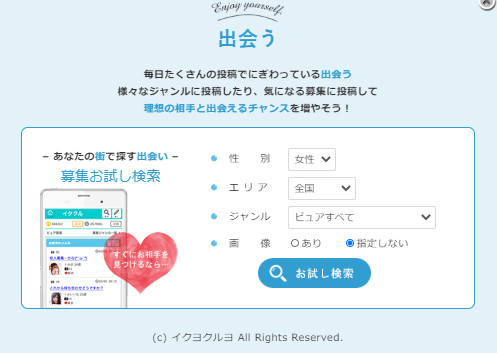 現代では、色々な機能がごちゃごちゃして、使い方が分かりにくい出会い系サイトなども多いですがイククルでは、女性を探して、メッセージをするだけなので初めて出会い系サイトを利用する方にも安心して利用して頂けます。